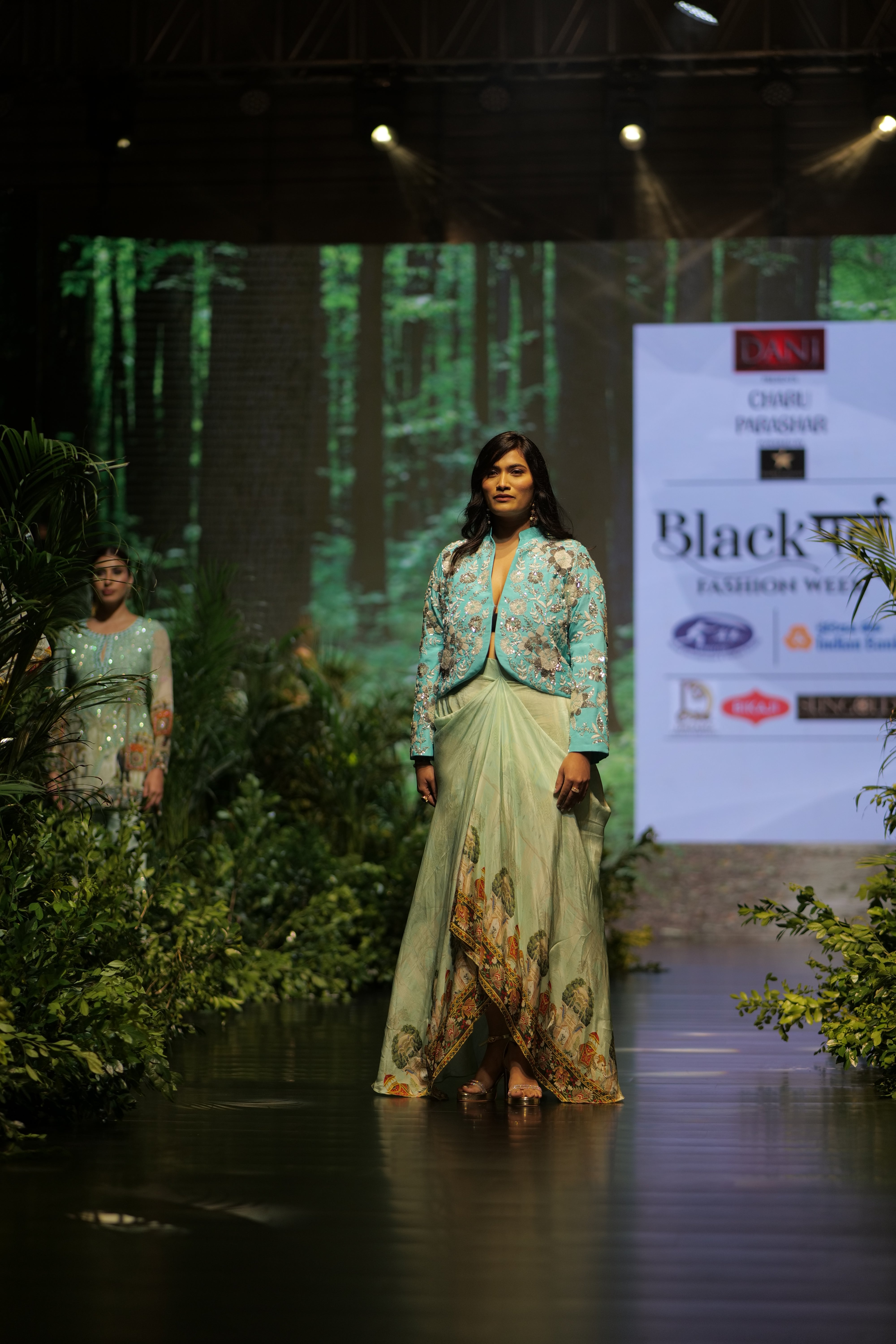 Elegant aqua embroidered jacket with printed skirt from the Mughal Pop collection. This sophisticated ensemble features a beautifully embroidered jacket paired with a printed skirt. Crafted in premium Crepe fabric for elegance and comfort. Perfect for weddings and special occasions.