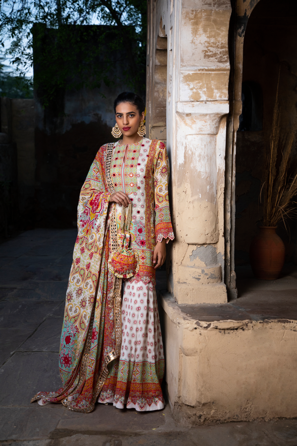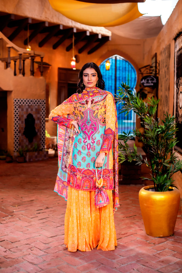 Step into elegance with our stunning sharara collection, where traditional silhouettes meet contemporary design. Each sharara set features flowing palazzo-style pants paired with beautifully embroidered kurtas and dupattas, creating a perfect blend of comfort and sophistication.